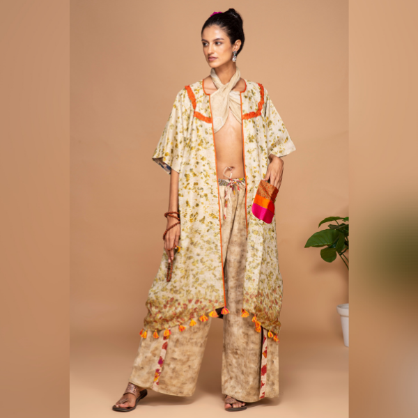 I am born to be regal; intertwined with golden threads of Tussar and Pashmina ; Born to a Kashmiri mother and Bihari Babu I am a product of India’s diverse heritage. I am handwoven and hand dyed in natural material of pious herbs and flower and then made reversible with beautiful Kalamkari and Bagru Siblings.  I love how my friend from Banaras adds that royal touch to me with its Zari thread. Wear me with your Saree, Pants or Dresses, I am sure to make you look Gorgeous plus I am one in two :D Article: Kimono Jacket Fabric:  Handloom Tussar Paschimna Inside fabric: Kalamkari  hand block printed cotton fabric Trims: Kinkhwab Brocade            Anchor thread tassels at the edge Length : 44’’