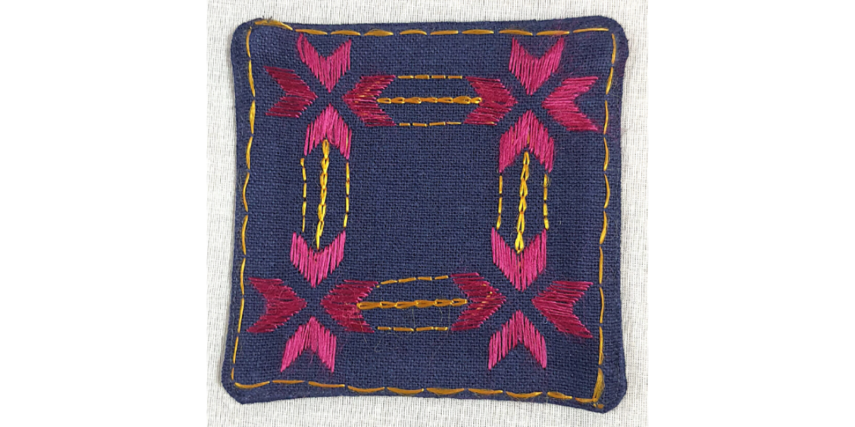 This unique coasters has been crafted exclusively for you by a woman artisan from a village in Nabha, using the indigenous skills of Phulkari. Adding to the uniqueness of this piece, the embroidery was done on a natural hand-woven cotton fabric. The technique used is by counting of threads. Motifs used were an adroit representation of the dear and sundry values of Punjab. Phulkari was a reflection of routine and regular life of a typical Punjabi woman